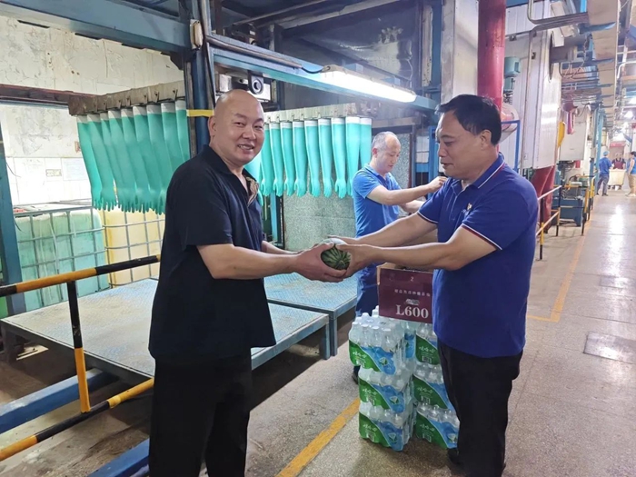 就在“职工之家”开放之际,一份清凉也送到了职工手中。近日,华腾橡塑领导专程来到瑞京公司生产一线,向在酷暑中仍然奋战在一线的干部职工送上清凉饮品和爽口西瓜,并对大家表示慰问,叮嘱大家要做好防暑降温工作。