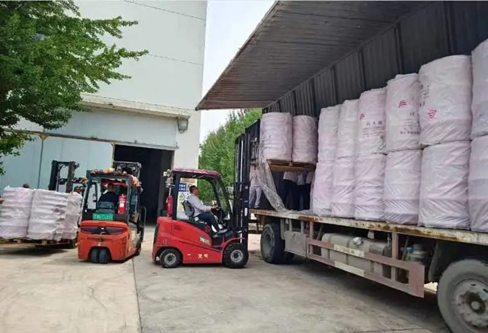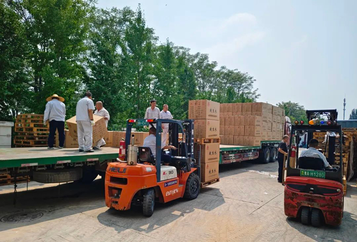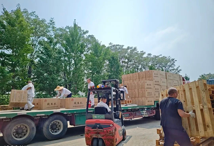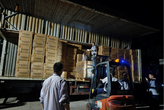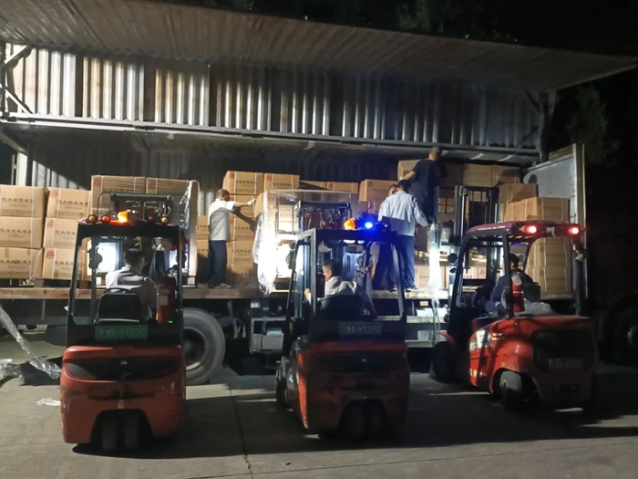 华腾化工立即调度人力、物力,争分夺秒组织应急物资配送。历经5个多小时不间歇备货、装载,满载应急物资的4辆大货车陆续发车,前往抗汛一线。