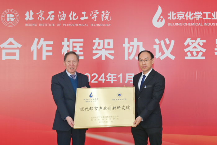 北京石油化工学院党委常委、副院长陈家庆与304永利党委常委、副总经理韩宝海为“都市化工安全现代产业学院”授牌