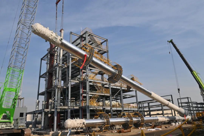 2021年12月31日,在304永利2022年度工作会刚刚闭幕之际,集团50项重点项目之一——PAE(聚芳醚)项目建设取得阶段性进展。位于单体精馏单元的两座精馏塔成功完成吊装,在2021年最后一天,两座核心装置吊装成功,不仅为京腾昊桦“大干100天,冲刺四季度”专项行动画上了圆满句号,更标志着PAE(聚芳醚)项目全面进入设备安装阶段。